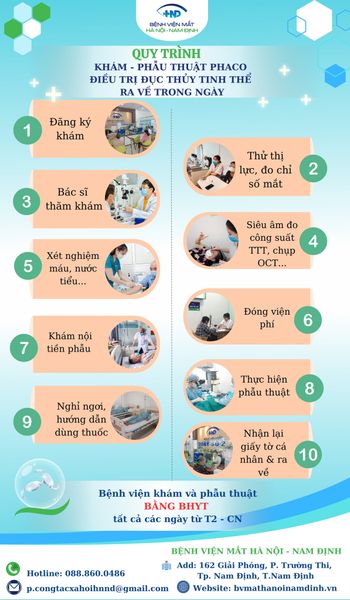 Trên đây là quy trình khám & phẫu thuật Phaco của Bệnh viện Mắt Hà Nội – Nam Định. Mọi thắc mắc xin gọi đến tổng đài Hotline: 088.860.0486 hoặc Facebook: Benhvienmathanoinamdinh.