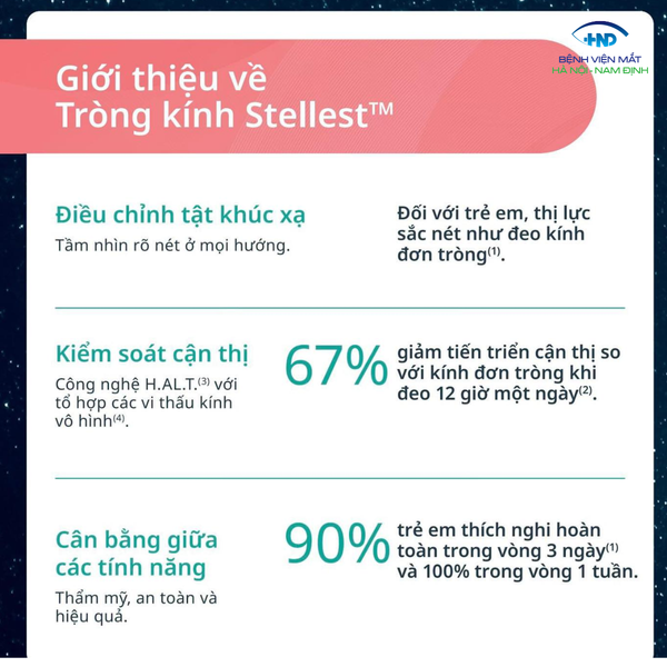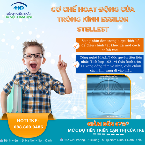 Essilor Stellest - tròng kính kiểm soát và làm chậm tiến triển cận thị ở trẻ em đến từ tập đoàn tròng kính số 1 trên thế giới. Với công nghệ đột phá, Stellest không chỉ mang đến tầm nhìn rõ nét mà còn bảo vệ đôi mắt trẻ em khỏi những biến chứng lâu dài, giúp các em tự tin khám phá thế giới mỗi ngày. Các bạn hãy tìm hiểu cùng các bác sĩ Bệnh viện Mắt Hà Nội - Nam Định nhé!