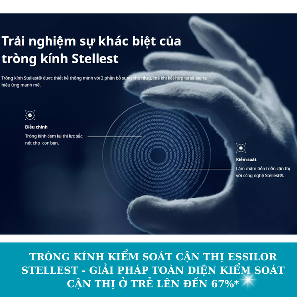 Essilor Stellest® là giải pháp lý tưởng để đồng hành cùng con bạn trong hành trình bảo vệ thị lực. Được chứng minh lâm sàng với khả năng làm chậm tiến triển cận thị, Stellest® không chỉ mang lại tầm nhìn rõ ràng mà còn bảo vệ đôi mắt của trẻ trong suốt quá trình phát triển. Đừng chỉ dừng lại ở việc điều chỉnh cận thị—hãy chọn Stellest® để kiểm soát và chăm sóc toàn diện, giúp con bạn tận hưởng cuộc sống với đôi mắt khỏe mạnh và sáng rõ.